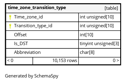 | PRIMARY | Primary key | Asc/Asc | Time_zone_id + Transition_type_id |