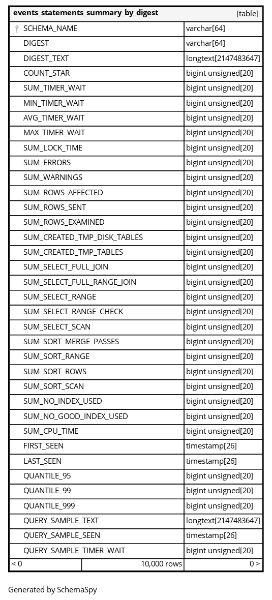 | SUM_ROWS_EXAMINED | BIGINT UNSIGNED | 20 | null |